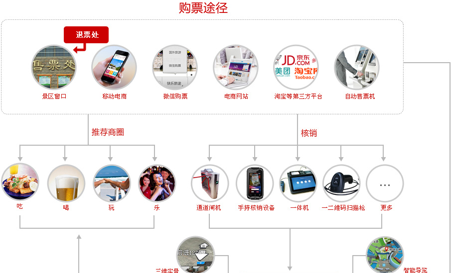 除了有景区实体票和电子票的售票等功能外还包括为景区搭建一套景区的完整的电商平台(互联网):电商+形象宣传(当然,形象宣传部分,涉及定制需另付),a 如景区没有宣传网站,我们可以帮助帮助搭建景区自己的电商形象宣传站,实现企业网站与电商网站的结合;b 如景区已有形象网站,可帮助其中一个栏目融入电商平台(用二级域名指向我们为景区建立的电商平台即可),实现在线购票,同时包括完整的电子票代理体系。